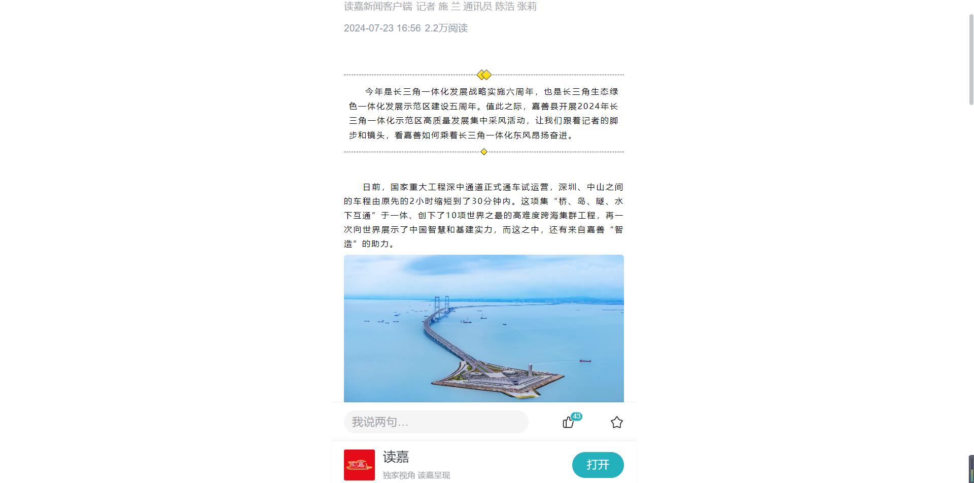 今年是長三角一體化發(fā)展戰(zhàn)略實施六周年,也是長三角生態(tài)綠色一體化發(fā)展示范區(qū)建設(shè)五周年。值此之際,嘉善縣開展2024年長三角一體化示范區(qū)高質(zhì)量發(fā)展集中采風(fēng)活動,讓我們跟著記者的腳步和鏡頭,看嘉善如何乘著長三角一體化東風(fēng)昂揚奮進。