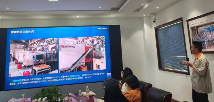 嘉善三思光電技術(shù)有限公司技術(shù)經(jīng)理?xiàng)铐樑d(右一)介紹企業(yè)技術(shù)情況 (曾慶華 攝)