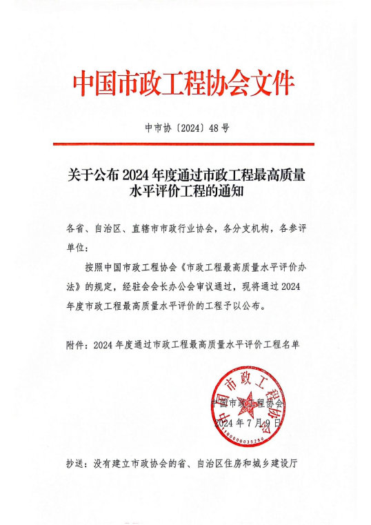 市政工程最高質(zhì)量水平評價(原中國市政金杯示范工程)由中國市政工程協(xié)會組織實施,是市政工程行業(yè)在工程質(zhì)量方面最高的質(zhì)量水平評價,代表市政工程行業(yè)同時期國內(nèi)先進水平。
