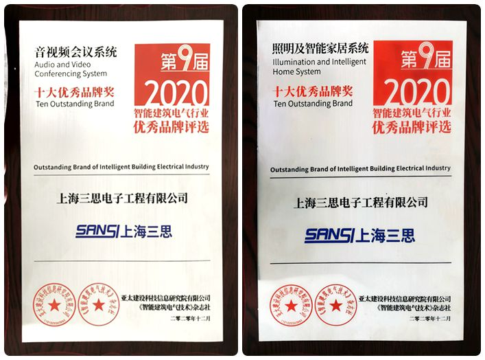 此次上海三思榮憑借出色的產(chǎn)品質(zhì)量和技術(shù)能力一舉榮獲“照明及智能家居系統(tǒng)十大優(yōu)秀品牌”“音視頻會議系統(tǒng)十大優(yōu)秀品牌”兩項殊榮。