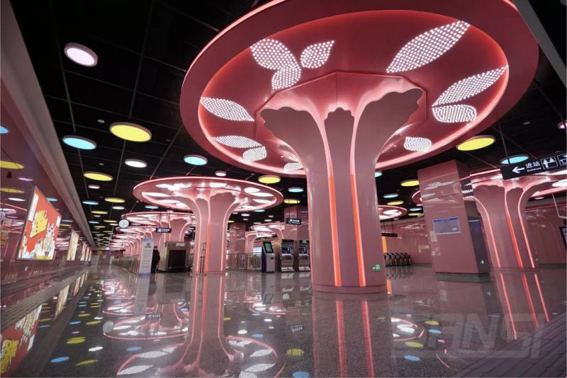 以錢湖南路站為例,該站以“繁花綻放”為主題,支柱造型設(shè)計為寧波市市花山茶花,寓意莘莘學(xué)子活力四射的精神面貌。三思發(fā)揮強大的定制能力,打造舒適而又富有特色的LED照明環(huán)境,造型獨特的異形燈在起到照明作用的同時,又很好地改善了地下空間原本沉悶的氛圍,增加了許多趣味性和藝術(shù)性,讓整個空間變得更加明亮又浪漫。