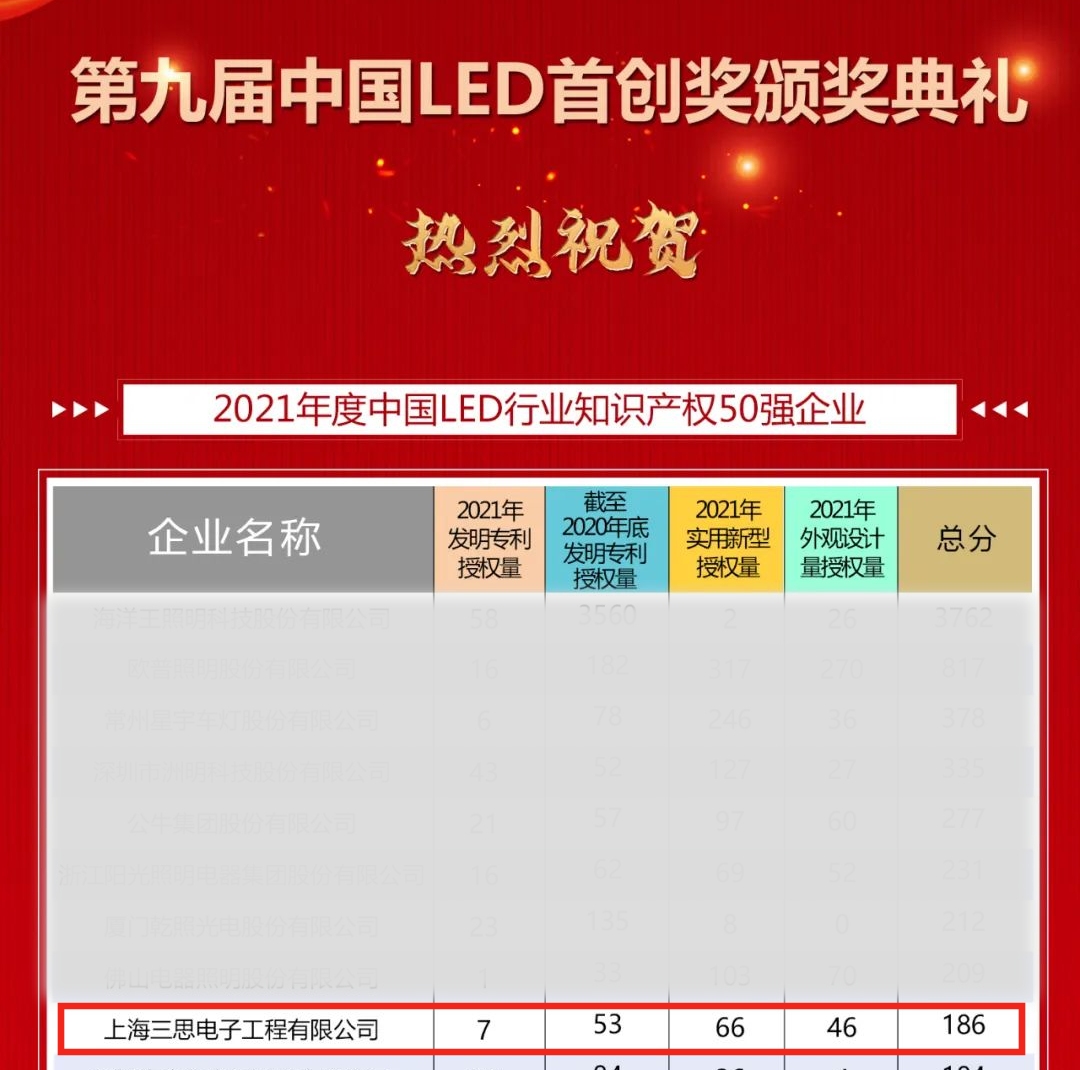 2022年8月3日,第九屆中國LED首創大會在廣州市廣交會展館隆重舉行。大會上發布了“第九屆中國LED首創獎2021年度中國LED行業營收50強、知識產權50強榜單”,上海三思強勢入圍前十強,獲評“2021年度中國LED行業知識產權50強企業”稱號。