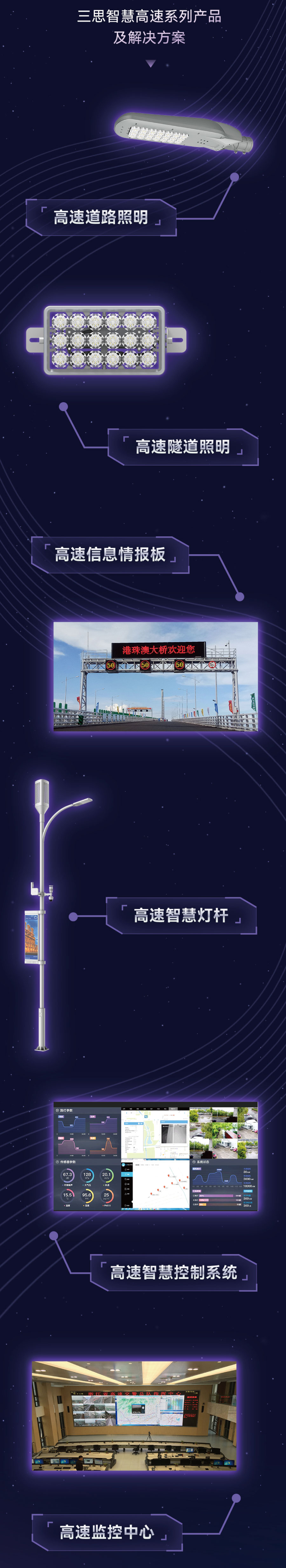 港珠澳大橋橫跨伶仃洋,由于特殊的自然條件,因此對產品要求非常之高。三思為其全線量身定制的近30000套(臺)LED信息情報板及照明產品,防海水鹽霧、抗臺風、防雷、耐高溫,助力港珠澳大橋成為國內乃至國際的標志性工程。