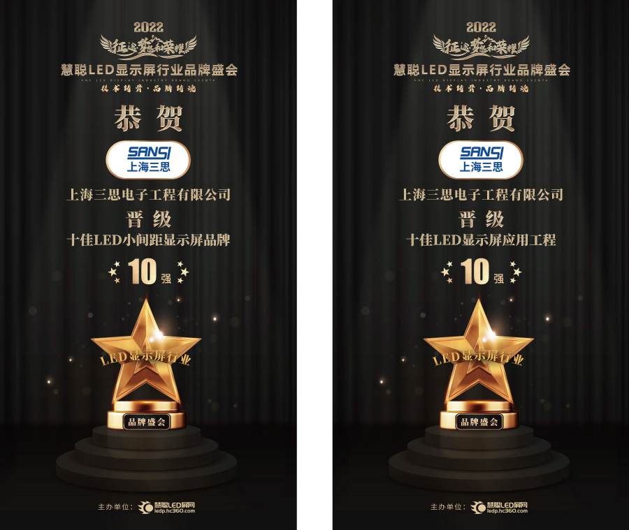 12月1日,“征途•夢想和榮耀”2022年度慧聰LED顯示屏行業品牌盛會十強榜單揭曉。經過長達三個月網絡投票、線上專家評審會,最終上海三思在層層評選環節中過關斬將,摘得“十佳LED顯示屏應用工程”桂冠及“十佳LED小間距顯示屏品牌”前三!