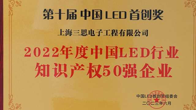 “LED首創獎”創立于2014年,是為表彰在中國LED行業做出突出貢獻的企業和個人而設立的年度獎項,堪稱LED行業的“奧斯卡頒獎”。本屆中國LED首創獎共收到幾百家企業的參評資料,競爭激烈,經過組委會,專家評審委員對申報企業的公平,公正的嚴格篩選,上海三思榮獲“2022年度中國LED行業知識產權50強企業”稱號。