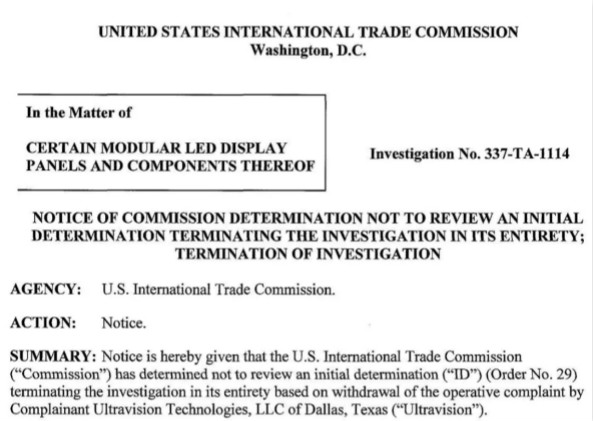公司動態 /2019-02-26美國時間2月21日,美國國際貿易委員會(ITC)正式下達決定:不復議ITC法官的初步裁決,始于2018年3月27日美國公司針對中國LED顯示屏企業發起的專利侵權案,原告現無條件撤訴!令人關注的LED顯示屏337案件正式結束調查。