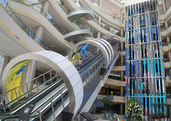 在城市規劃館、科技館、博物館、創意中心、大型綜合體等場景,經常能看到一些由LED柔性屏組成的藝術造型各異的弧形屏、圓柱屏、球形屏、可穿戴屏、飄帶屏等。LED柔性屏主要是通過使用柔性材料和柔性電路來實現彎曲、卷起和折疊等變形過程,這使得LED柔性屏可以在各種形狀的表面上使用,包括弧形、圓形、球形和不規則形狀等。配以輕薄、靈活、高清晰度、高亮度等特點,能夠勝任各種復雜的應用場景。